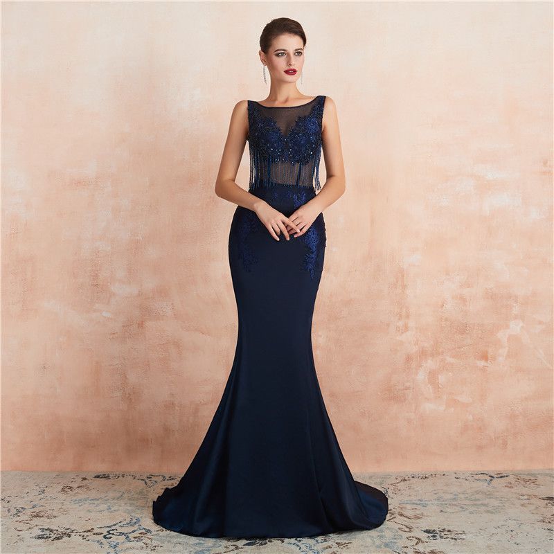 Robe Bleu Nuit Encolure Illusion Orne De Bijoux Pour Soiree